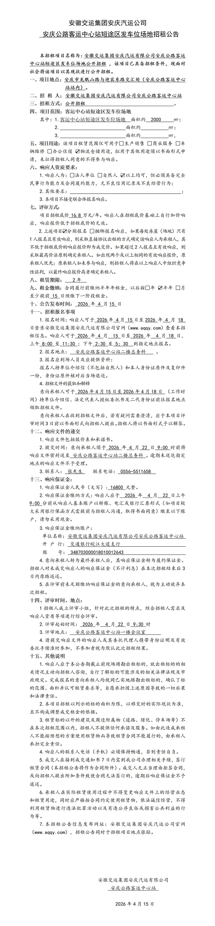 安慶中心站短途廳招租公告